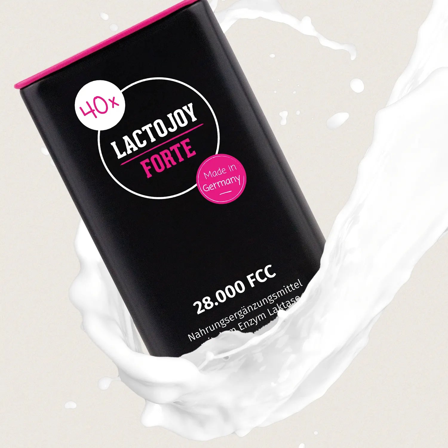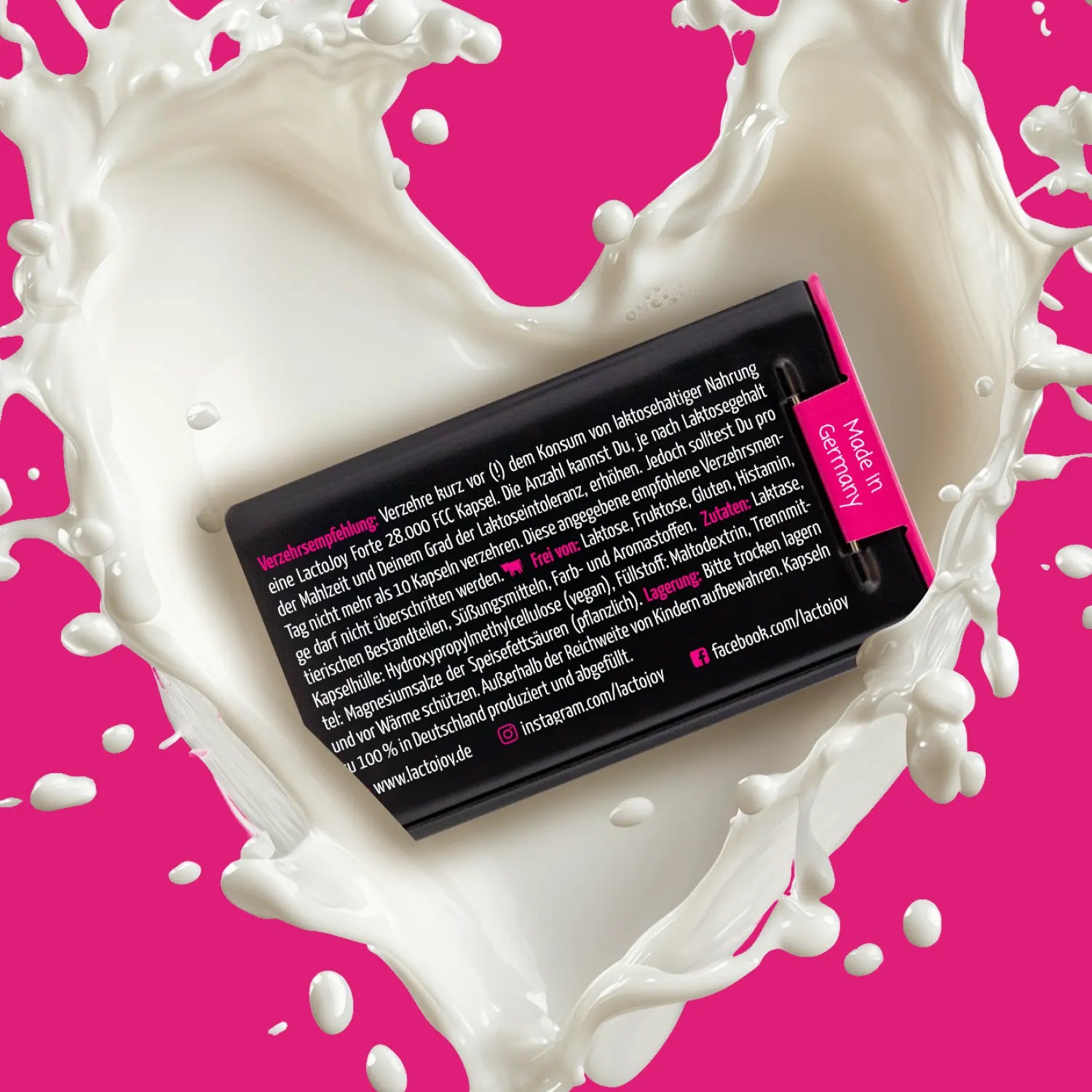 LactoJoy ist außerdem mit 28.000 FCC-Einheiten relativ hoch dosiert. Das ermöglicht dir eine hohe Wirksamkeit. Da Laktase nicht überdosiert werden kann und keine Nebenwirkungen aufweist, dachten wir uns: Spar dir die Sorge darüber, wie viel Milchzucker in deiner Mahlzeit enthalten ist. Denn das ist sowieso meistens nicht eindeutig herauszufinden. Bei der hochdosierten Laktase wird der Milchzucker in der Mahlzeit zuverlässig gespalten.